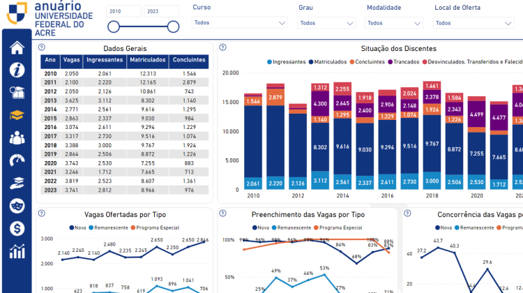 Disponibilizado em painéis desenvolvidos em Business Intelligence (BI), a ferramenta integra as informações detalhadas sobre dados de ensino, pesquisa e extensão universitária, cursos acadêmicos, gestão de pessoas, avaliação institucional, assistência estudantil, orçamento, infraestrutura e outros dados relacionados à gestão e aos resultados da instituição, sintetizados através de gráficos e tabelas, e por meio de uma série histórica dos últimos anos.
