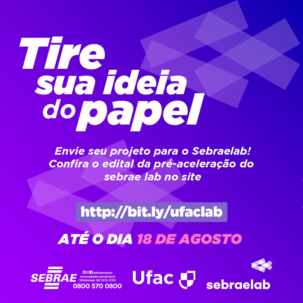 A Ufac, em parceria com o Serviço de Apoio às Micro e Pequenas Empresas do Acre (Sebrae-AC), está com seleção pública aberta para escolha de projetos de inovação no âmbito do projeto SebraeLab/Ufac. Ao todo, serão selecionadas até 20 propostas para aplicação de metodologias ágeis e de educação empreendedora.