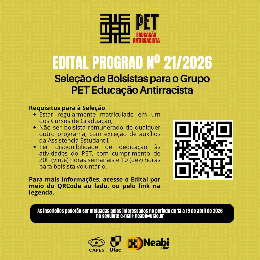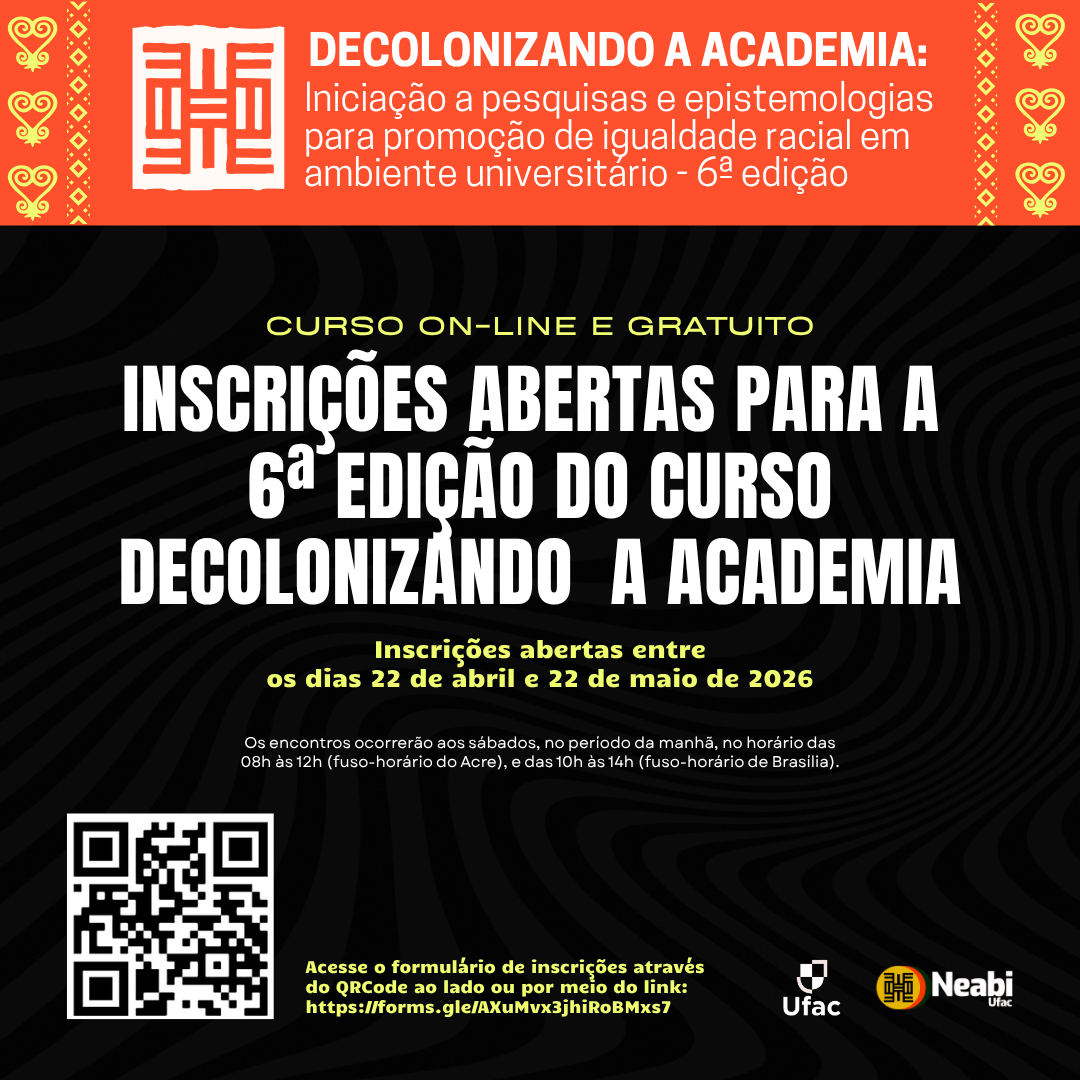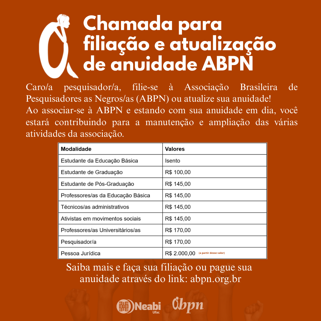 O Núcleo de Estudos Afro-Brasileiros e Indígenas da Universidade Federal do Acre (Neabi/Ufac), vinculado à Associação Brasileira de Pesquisadores/as Negros/as (ABPN), convida pesquisadoras, pesquisadores, estudantes e apoiadores/as da luta antirracista a se filiarem ou atualizarem sua anuidade junto à ABPN.