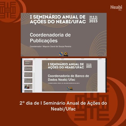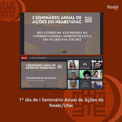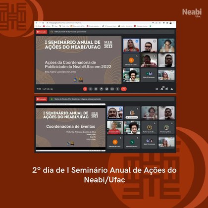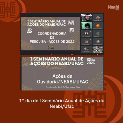 O 1º Seminário de Ações do Neabi/Ufac foi realizado nos dias 30 e 31 de janeiro de 2023, de forma virtual (através do Google Meet). O evento marcou o início de uma prática que aconteceria anualmente e teve como objetivo apresentar à comunidade acadêmica e à sociedade em geral um balanço das atividades desenvolvidas pelo núcleo, reforçando o compromisso com a transparência e a promoção do diálogo sobre as ações realizadas.