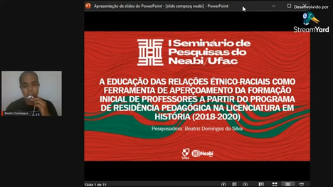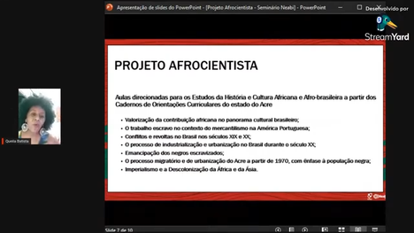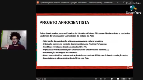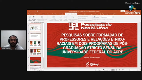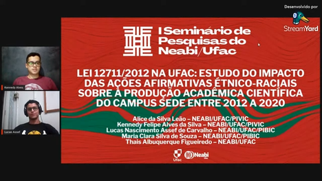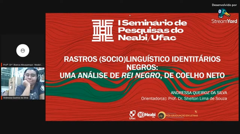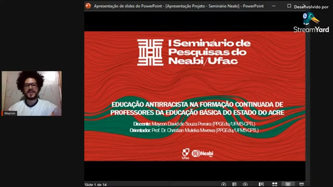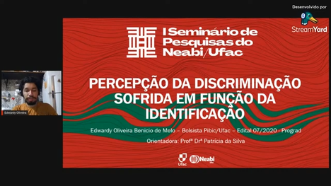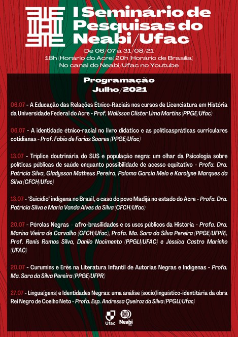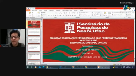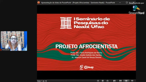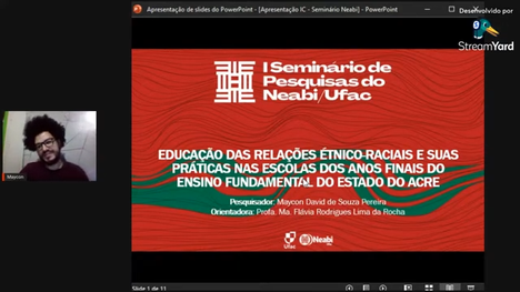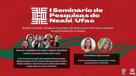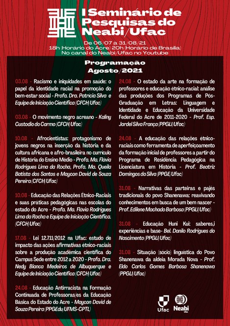 O I Seminário de Pesquisas do Neabi/Ufac aconteceu entre 06 de julho a 31 de agosto de 2021, com encontros semanais transmitidos ao vivo pelo YouTube. Realizado às 18h (horário do Acre), o evento reuniu pesquisadoras, pesquisadores, estudantes e representantes de comunidades tradicionais para discutir temáticas étnico-raciais voltadas às populações negras e indígenas. O seminário fortaleceu redes de pesquisa e reafirmou o compromisso do Neabi/Ufac com a educação antirracista e a valorização das identidades historicamente marginalizadas.