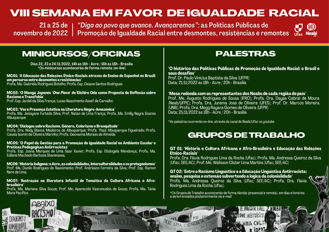 O Núcleo de Estudos Afro-Brasileiros e Indígenas (Neabi/Ufac) promoveu, no mês de novembro de 2022, o 5º Novembro Negro, um evento integrante de uma campanha anual que visa recordar e evidenciar as lutas e resistências da população negra contra o racismo, o preconceito, a discriminação racial e as desigualdades sociais.