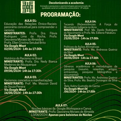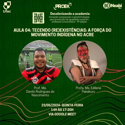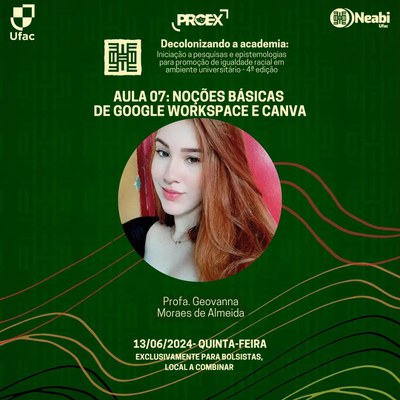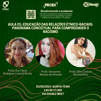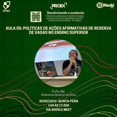 É com imensa alegria que o Núcleo de Estudos Afro-brasileiros e Indígenas da Universidade Federal do Acre (Neabi/Ufac) anuncia as inscrições da 4ª edição do curso de extensão "Decolonizando a academia: iniciação a pesquisas e epistemologias para promoção de igualdade racial em ambiente universitário".