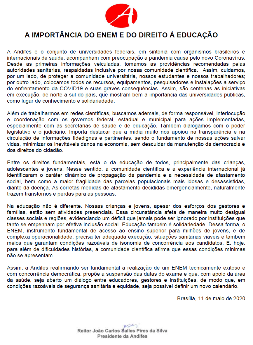 Notícias Nota Pública da Andifes: A Importância do Enem e do direito à Educação publicado: 14/05/2020 09h28, última modificação: 14/05/2020 09h30