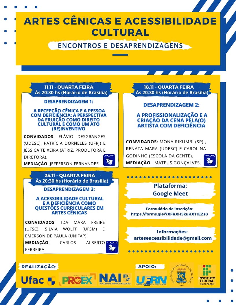 O curso de Artes Cênicas da Ufac, por meio do projeto de extensão Teatro e Educação Inclusiva, realiza o 1º Encontro Artes Cênicas e Acessibilidade Cultural: Encontros de Desaprendizagens. O evento ocorre na plataforma Google Meet e com transmissão pelo YouTube nos dias 11, 18 e 25 de novembro. As inscrições estão abertas até as datas dos encontros.