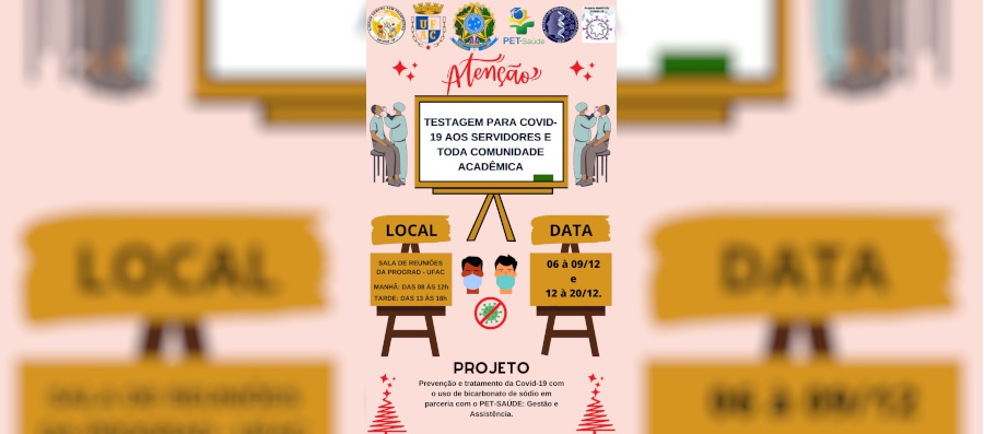 O projeto Prevenção e Tratamento da Covid-19 com o Uso do Bicarbonato de Sódio, da Ufac, coordenado pela professora Carolina Pontes, e o Programa de Educação Tutorial (PET) Saúde: Gestão e Assistência, realizam testagem para covid-19 aos servidores e toda comunidade acadêmica, de 12 a 20 de dezembro, na sala de reuniões da Pró-Reitoria de Graduação, campus-sede, das 8h às 12h e das 13h às 18h.