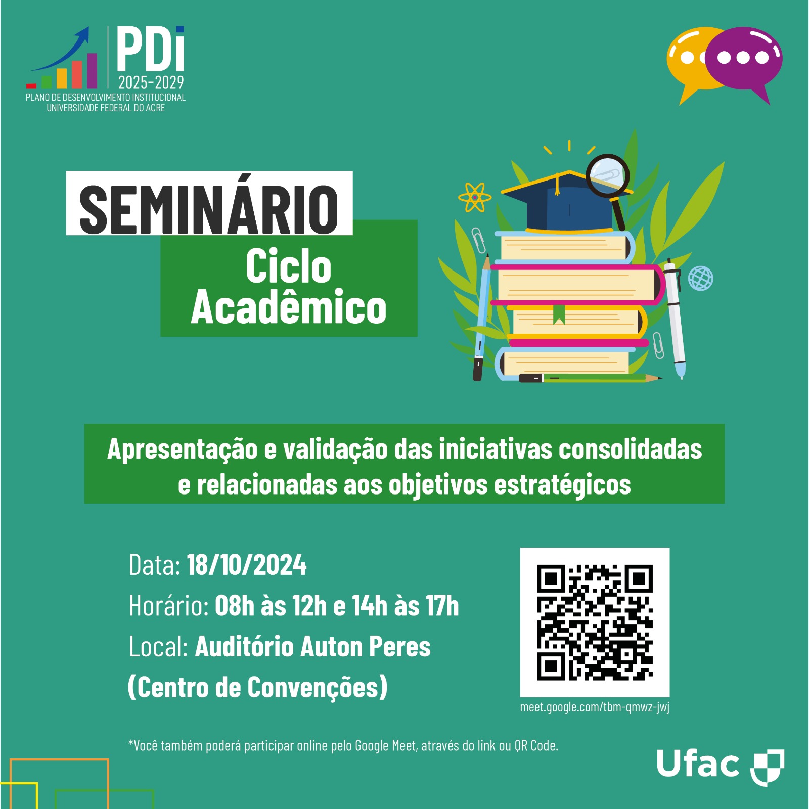 Os seminários são referentes à etapa 4 da elaboração do Plano de Desenvolvimento Institucional (PDI) para o período 2025-2029 e ocorrem no horário das 8h às 12h e das 14h às 17h.