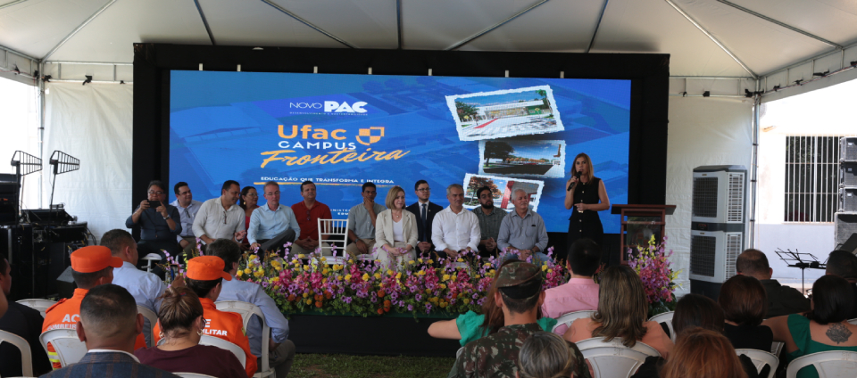 A Ufac realizou, na sexta-feira, 7, em Brasileia, a solenidade de assinatura da ordem de serviço para a consolidação da obra de expansão do campus Fronteira do Alto Acre. O evento marca o início de uma nova etapa para a instituição e para a região, com investimento de R$ 40 milhões do governo federal, por meio do Novo Programa de Aceleração do Crescimento.