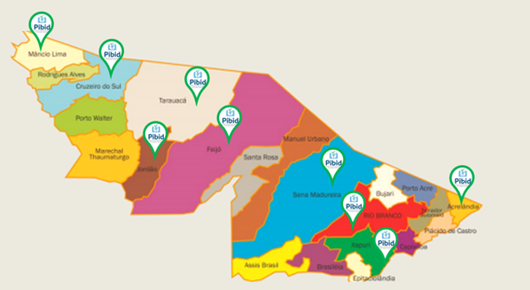 Na Ufac, o Pibid subsidia a execução de diversos Núcleos de Iniciação a Docência (NID) distribuídos entre os municípios em que a universidade oferece cursos de licenciatura, nos campi Sede e Floresta, inclusive cursos EaD. Nesta edição do Pibid, há núcleos nos municípios de: Rio Branco, Cruzeiro do Sul, Tarauacá, Jordão, Mâncio Lima e Xapuri, totalizando 67 escolas com presença de bolsistas Pibid que são supervisionados por professores lotados nas respectivas escolas. Cada núcleo é coordenado por um professor da Ufac, responsável pela formação de seus alunos de iniciação à docência.